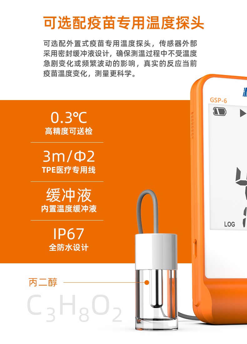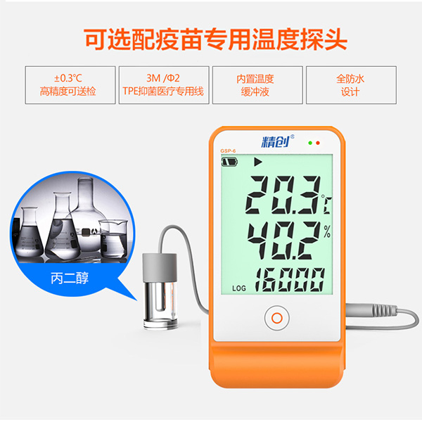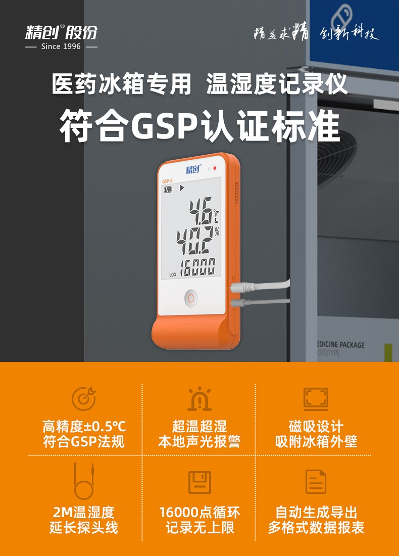 精創(chuàng)GSP-6溫濕度記錄儀主要用于監(jiān)測記錄食品、藥品、化學(xué)用品等產(chǎn)品在存儲和運輸過程中的溫濕度數(shù)據(jù),廣泛應(yīng)用于倉儲、物流冷鏈的各個環(huán)節(jié)。該記錄儀符合新版GSP 要求,LCD 大屏顯示,超限聲光報警,單按鍵操作,內(nèi)置溫度傳感器、外置溫濕度傳感器,支持記滿停止和循環(huán)覆蓋兩種存儲方式,可設(shè)置超限自動縮短記錄間隔功能。